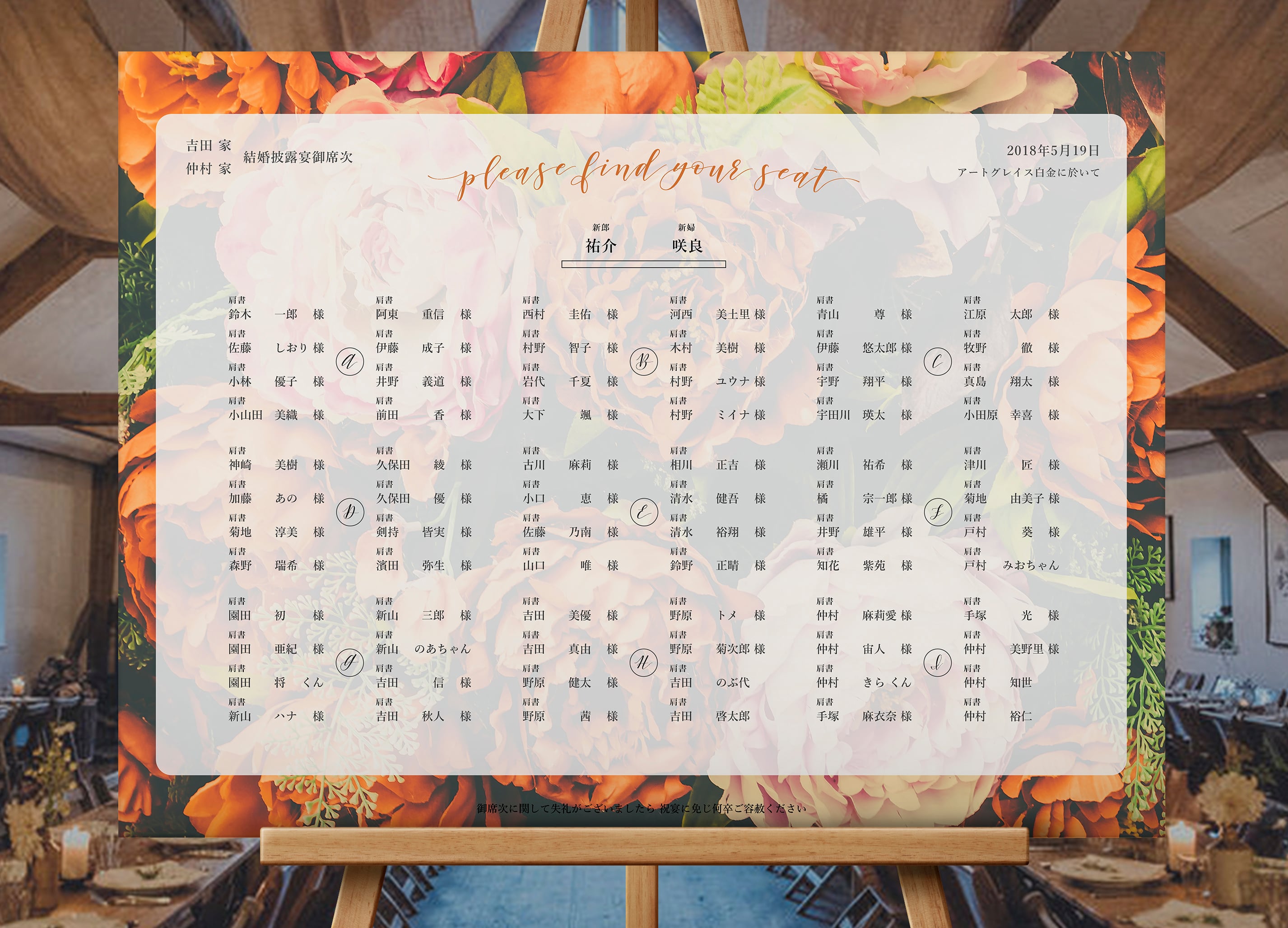 そのかわりに「シーティングチャート」「テーブルサイン」と呼ばれるボードで自分のお席を確認してもらいます。