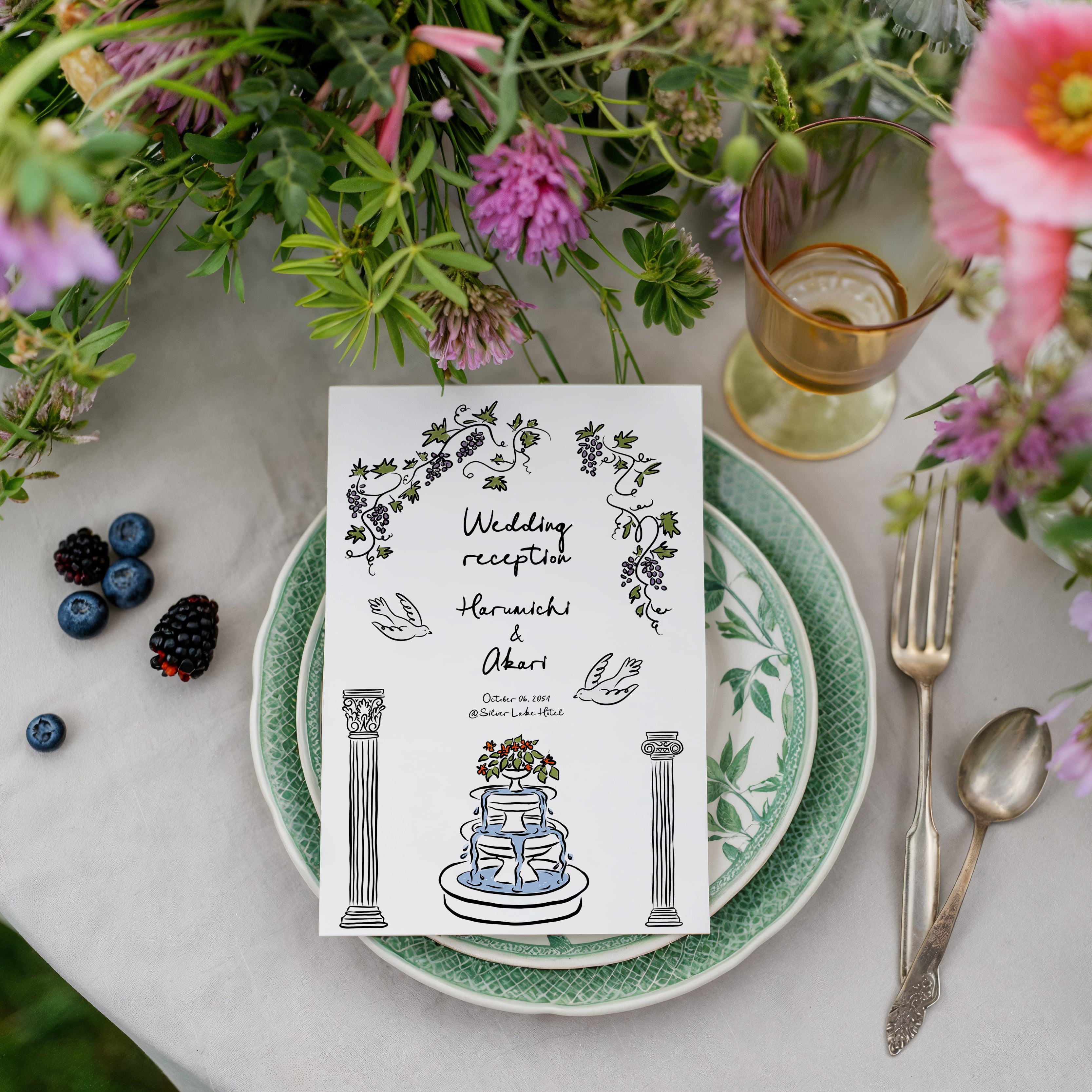 全てのページにイタリア ローマをイメージした手描きのかわいいイラストをあしらったスペシャルな2つ折り席次表です。