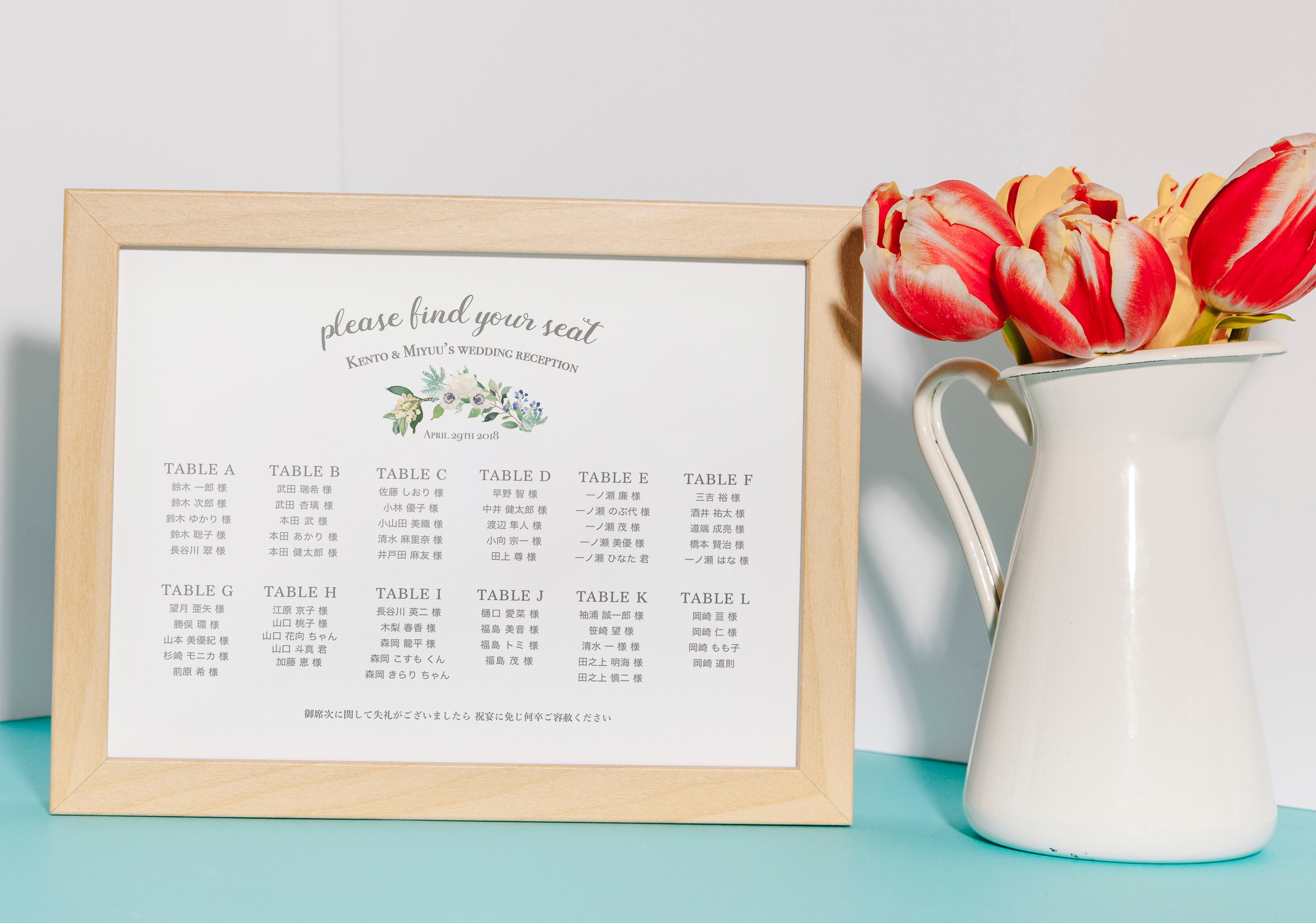 そのかわりに「シーティングチャート」「テーブルサイン」と呼ばれるボードで自分のお席を確認してもらいます。