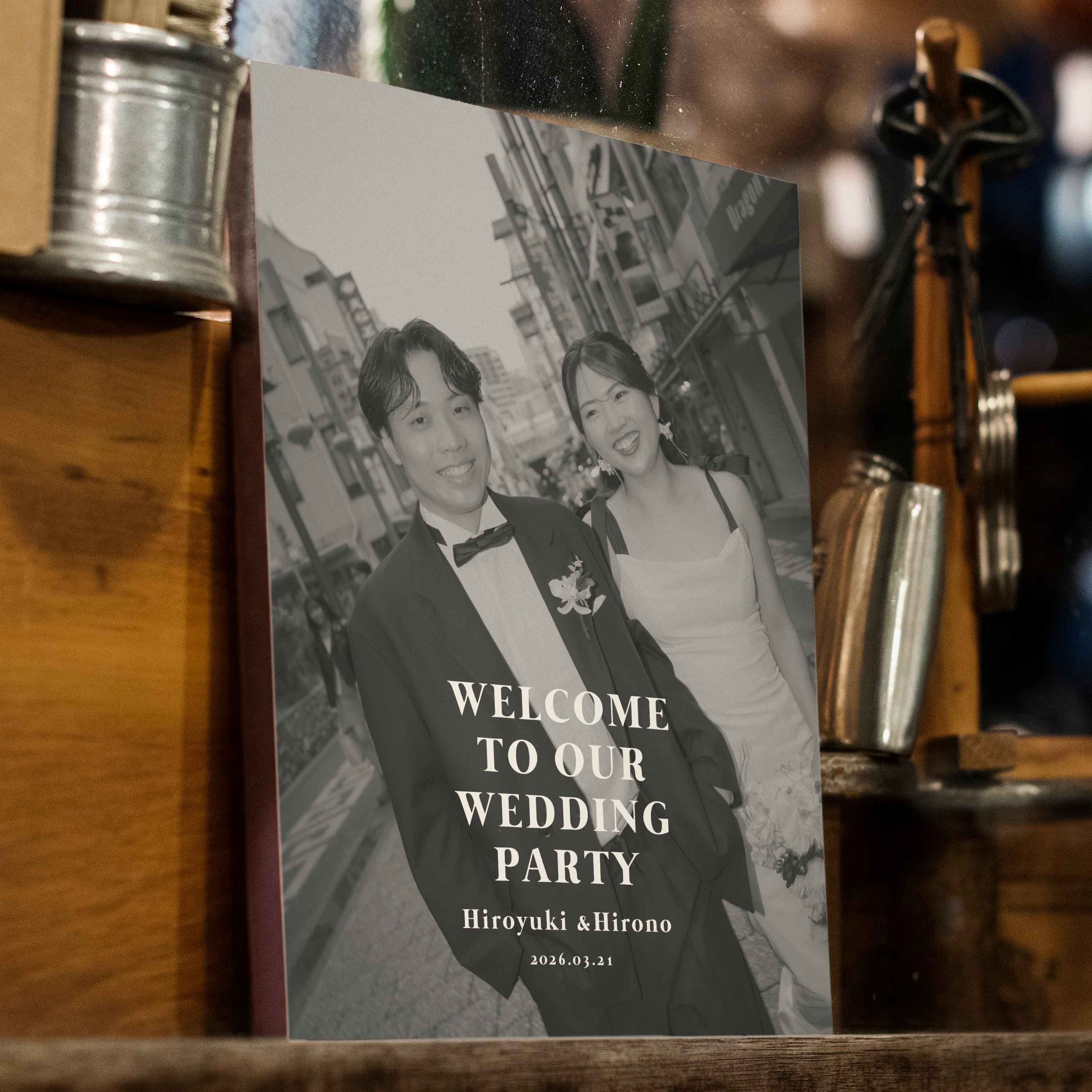 こちらはどんな結婚式、お写真にもぴったりのシンプルな白黒写真とブロック体を使用したミニマルデザインのウェルカムボードです。