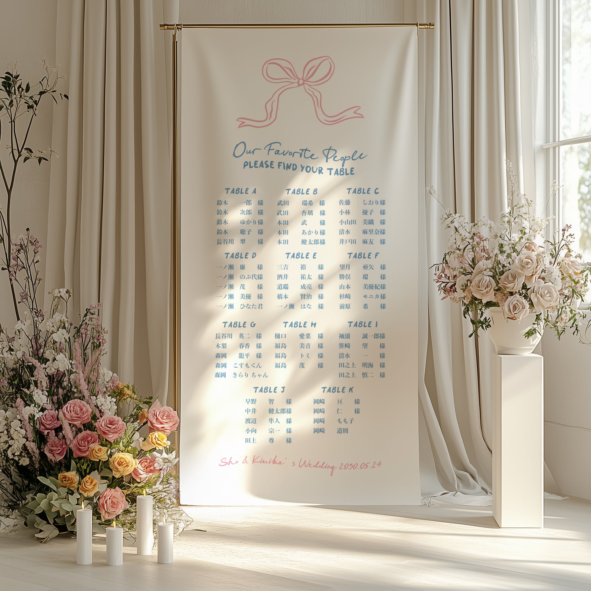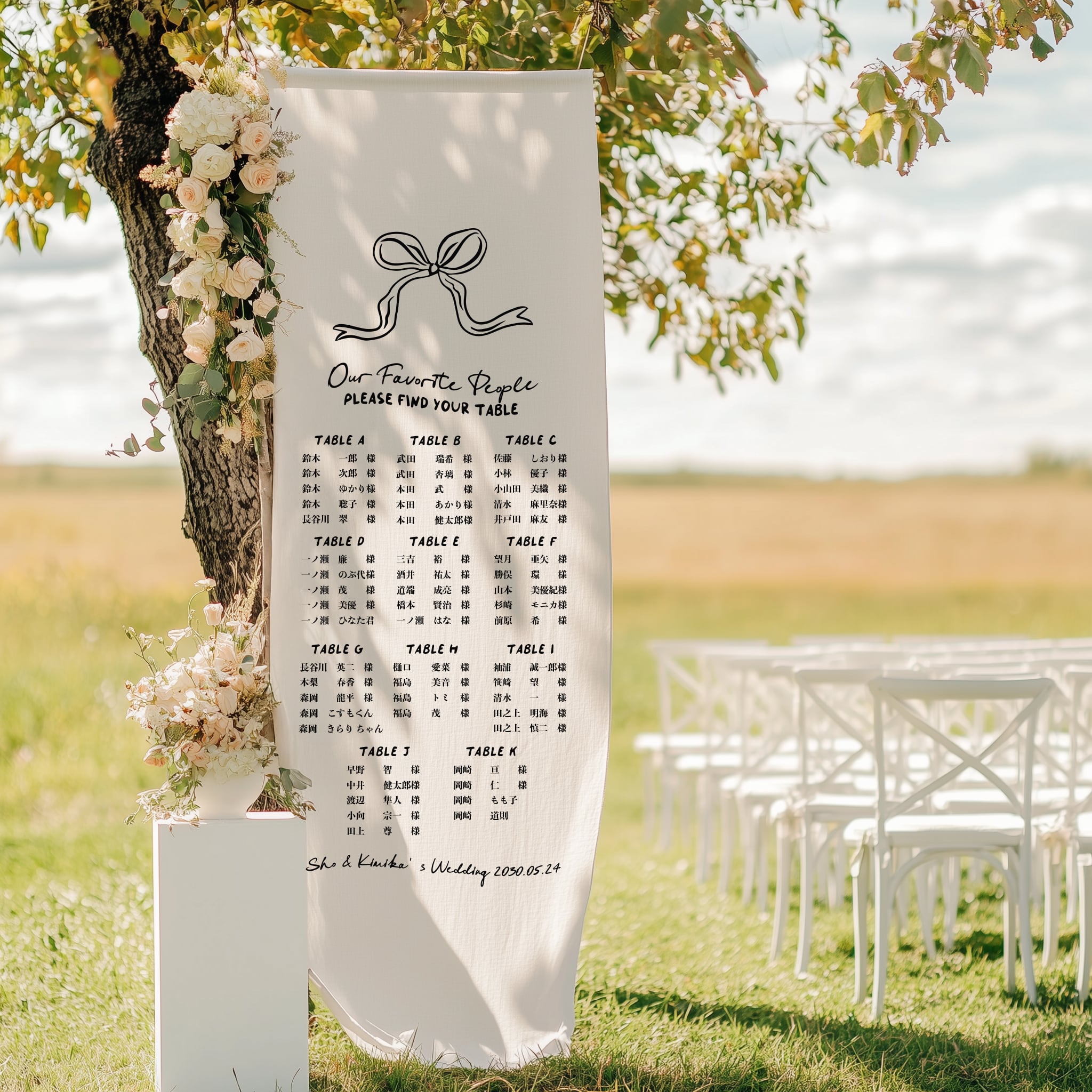 そのかわりに「シーティングチャート」「テーブルサイン」と呼ばれるボードやタペストリーご自身のお席を確認してもらいます。