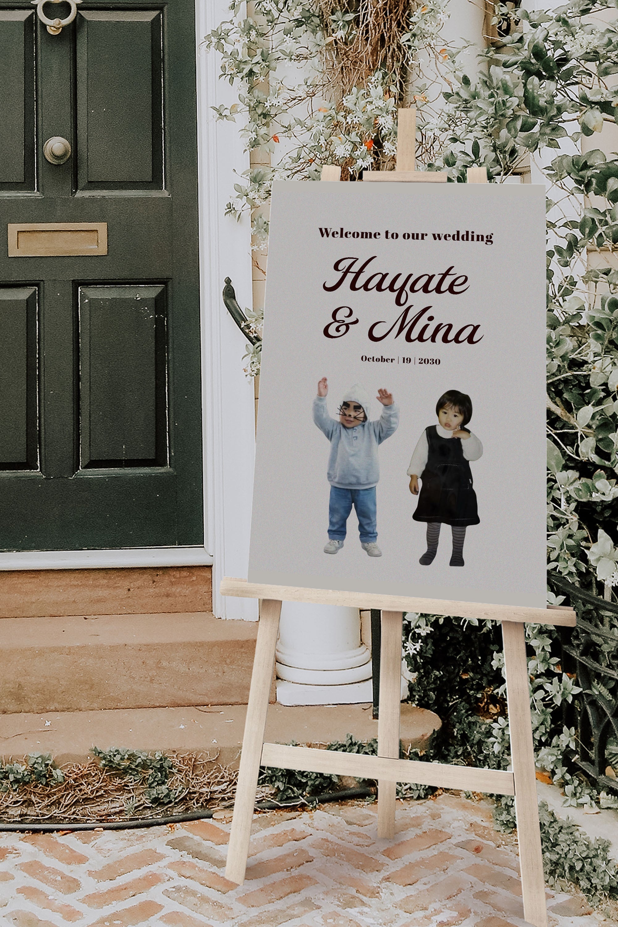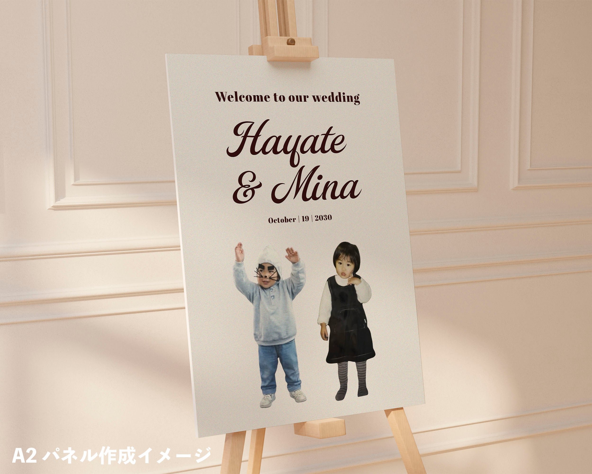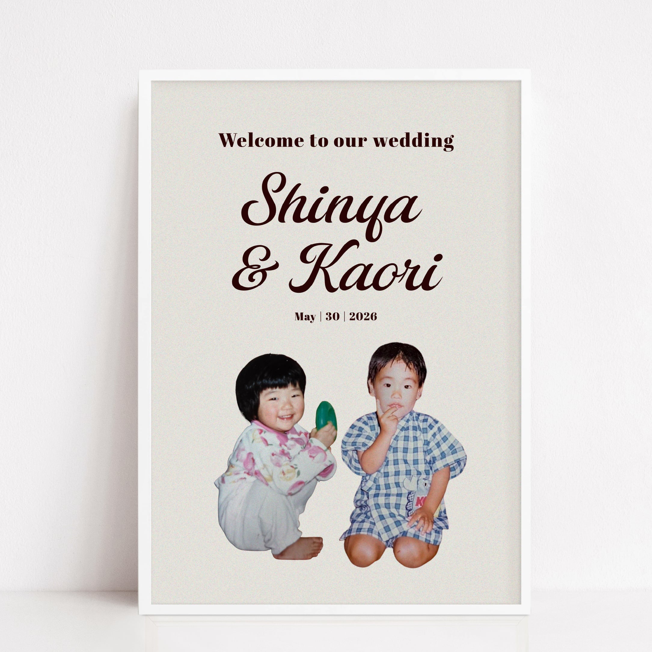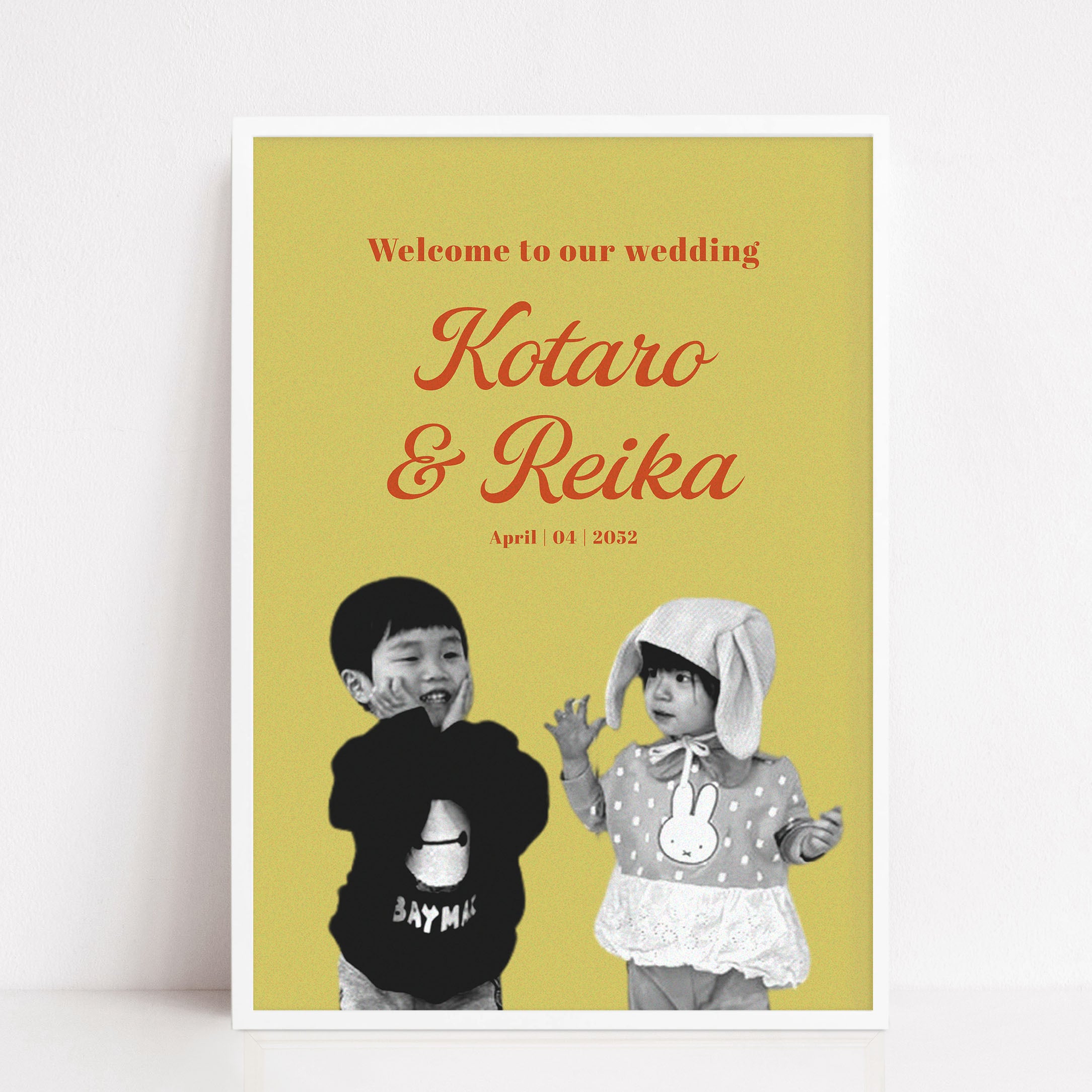 お二人の幼少期の写真を使用して作成するキュートなウェルカムボードです。