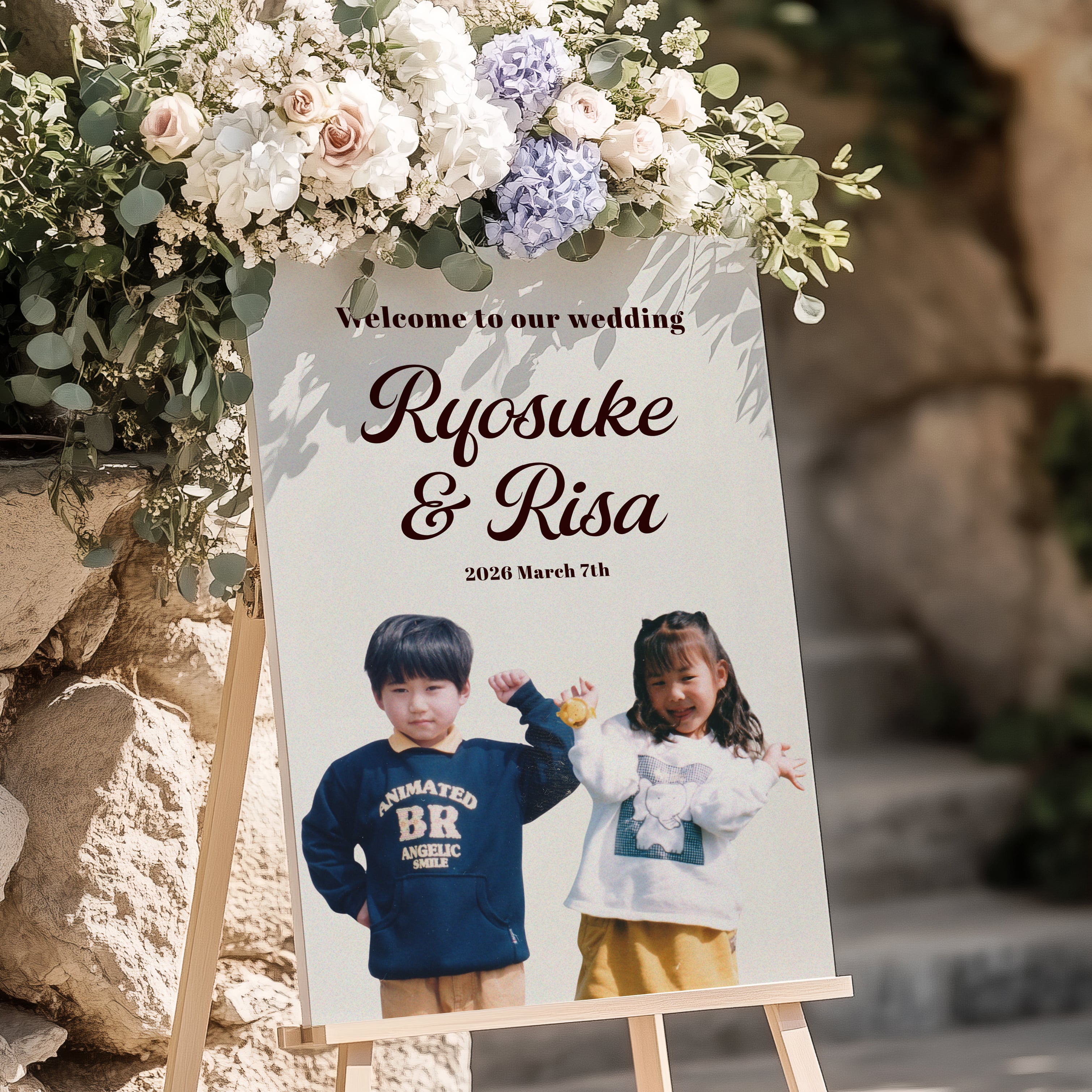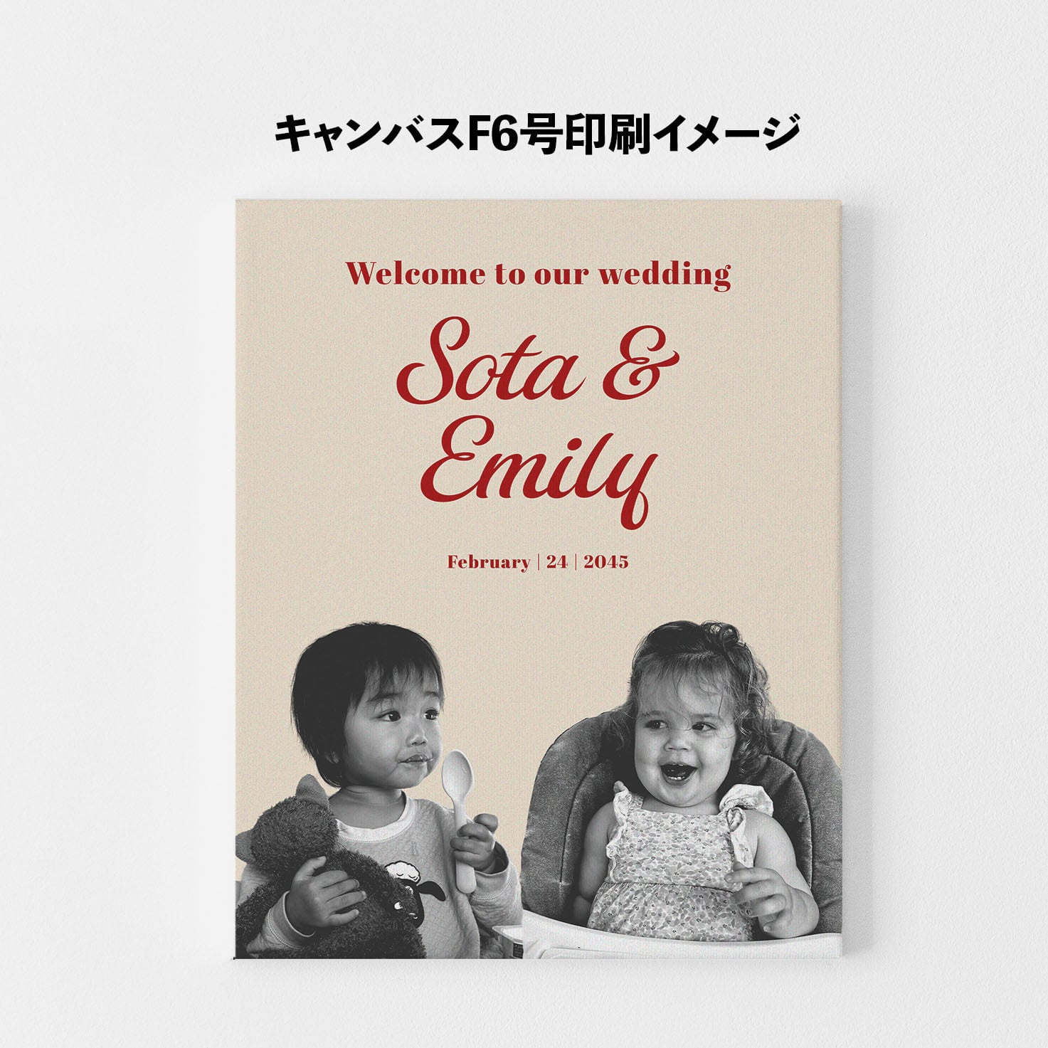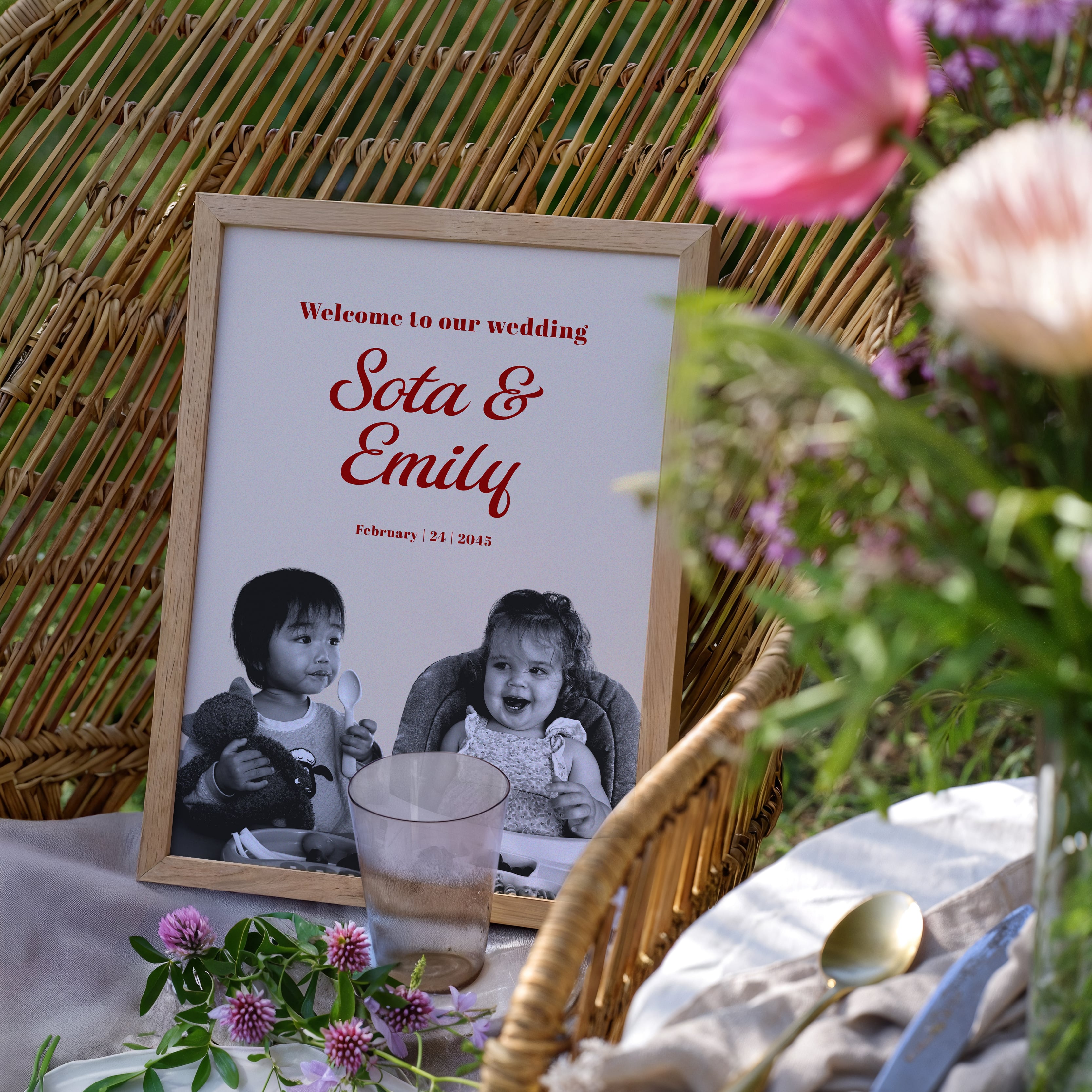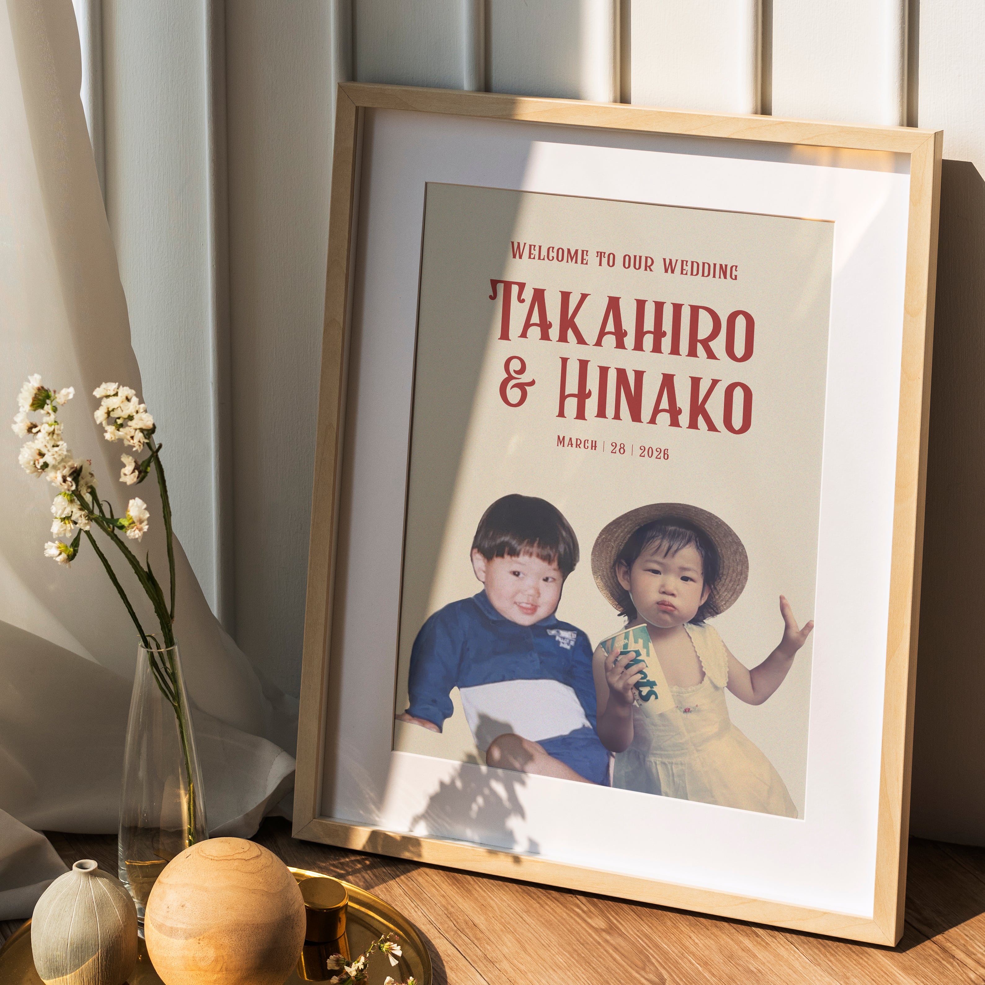 お二人の幼少期の写真を使用して作成するキュートなウェルカムボードです。