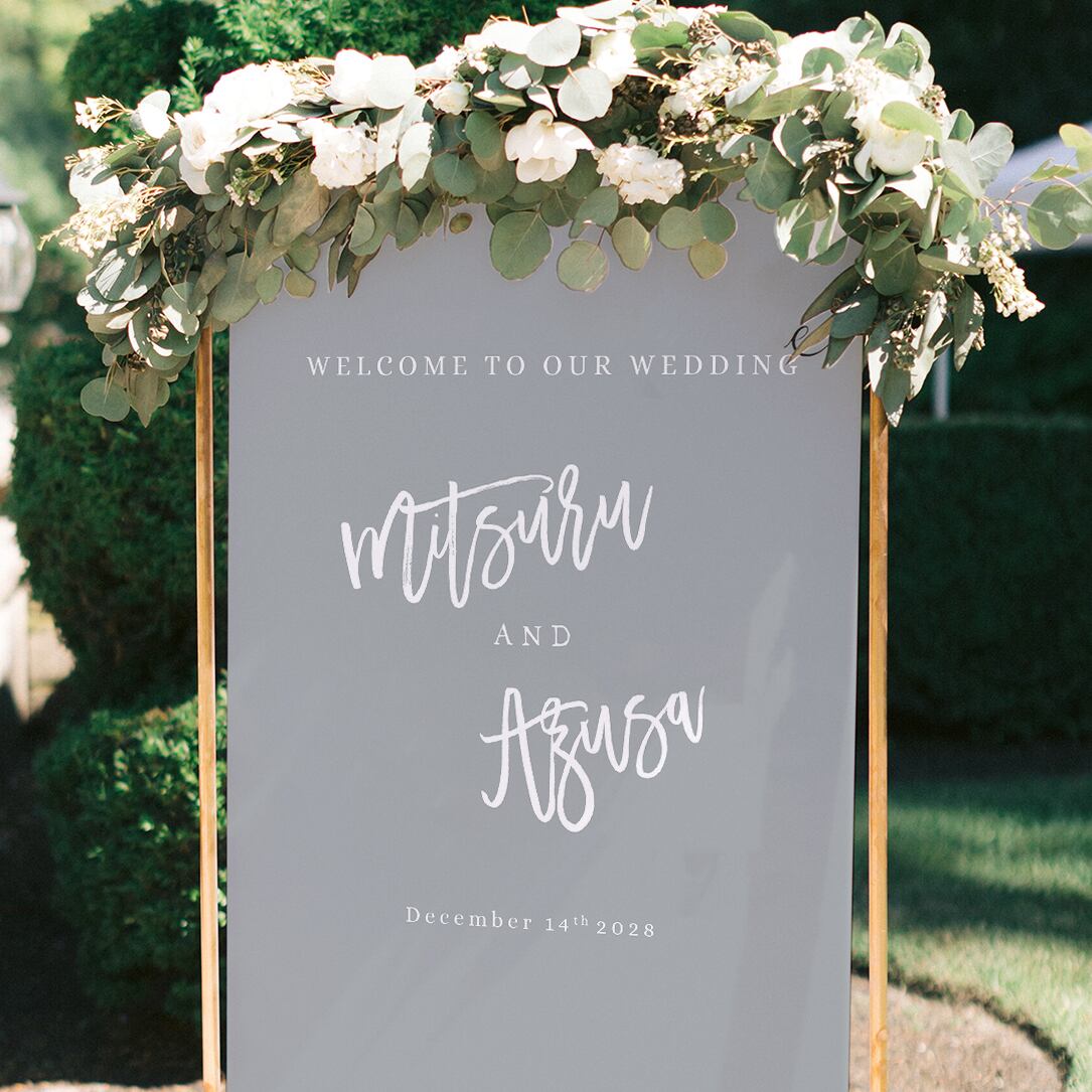 くすみブルーとシンプルだけどトレンド感のあるロゴがかわいいウェルカムボードです。