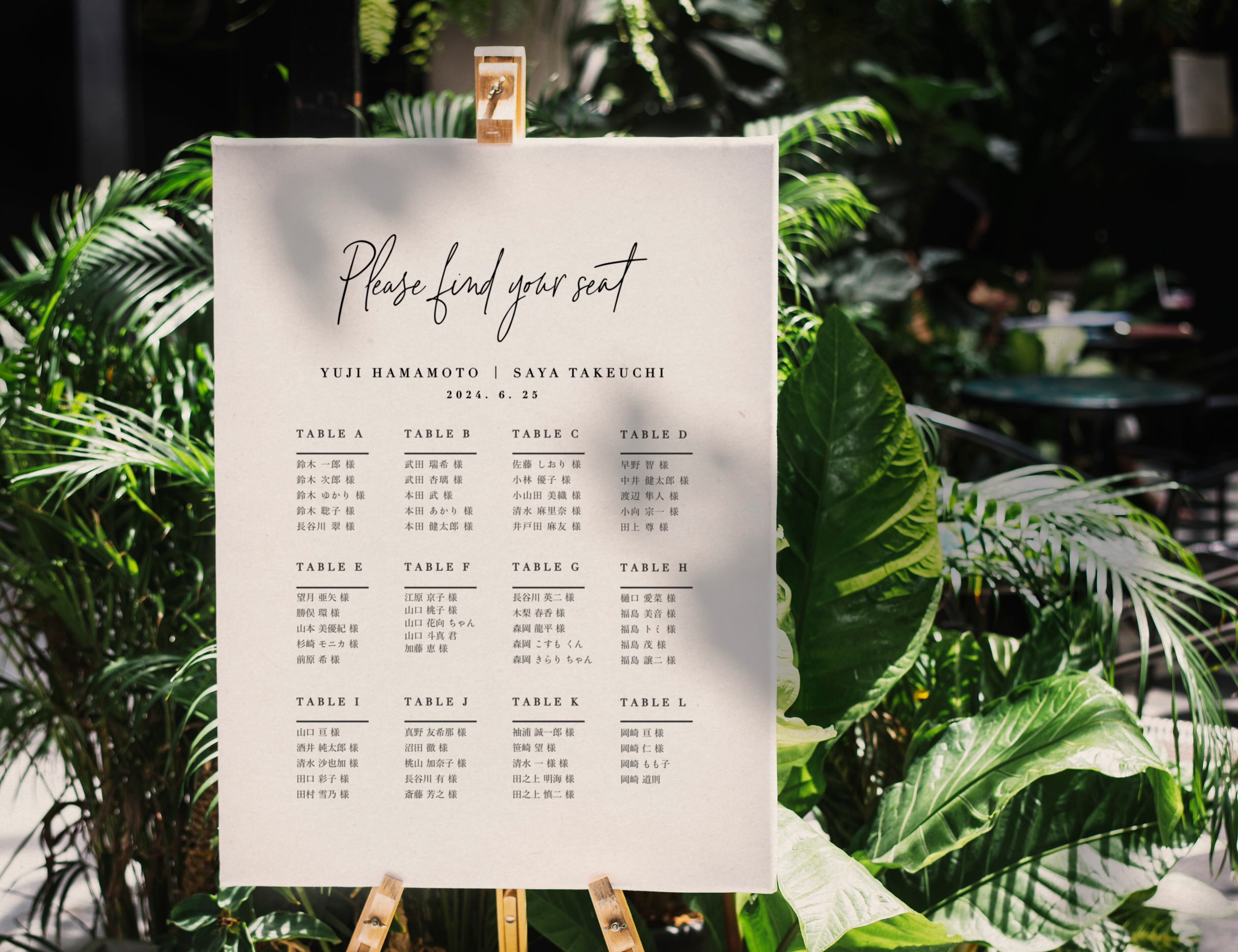 そのかわりに「シーティングチャート」「テーブルサイン」と呼ばれるボードで自分のお席を確認してもらいます。