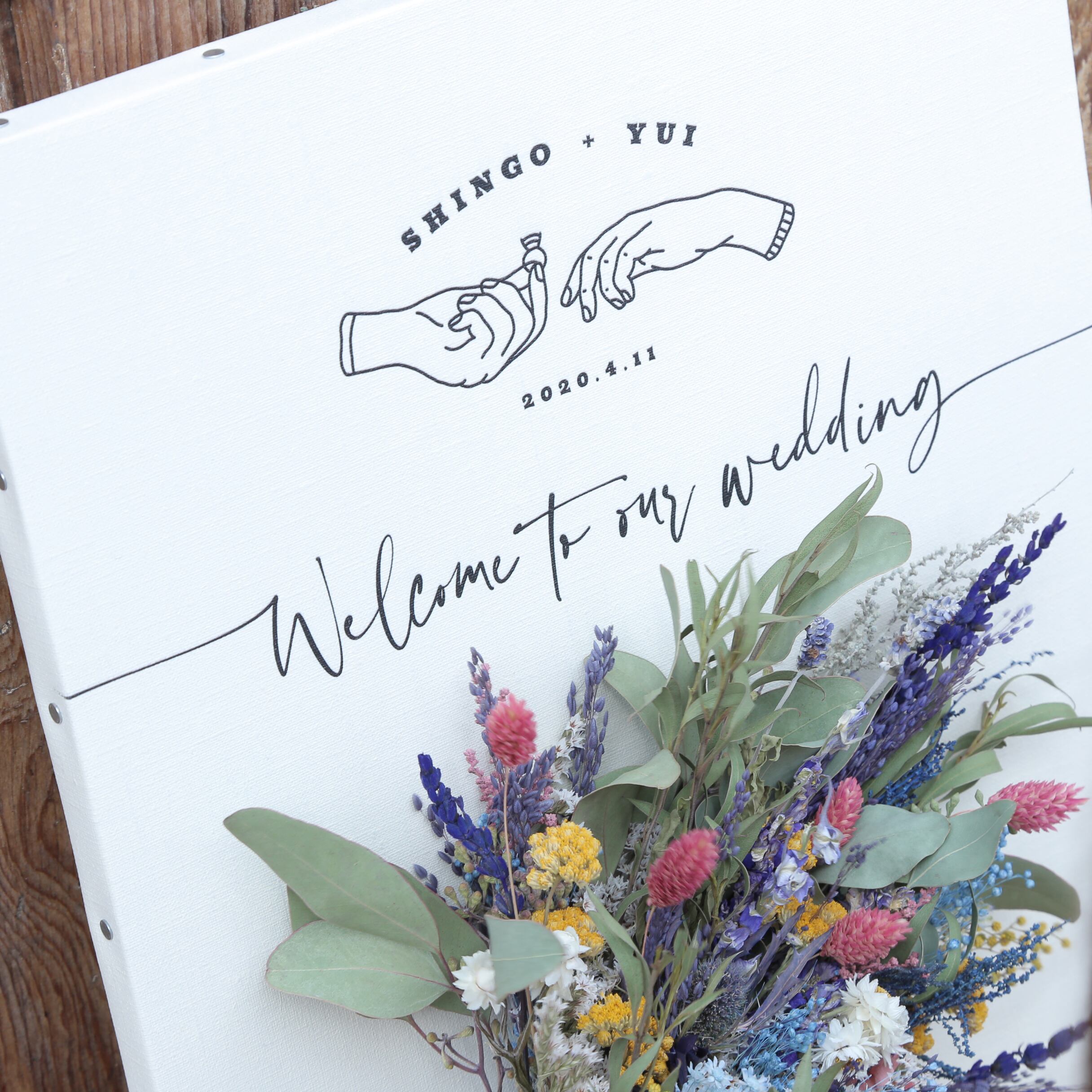 ピンク・白・黄色・紫・青色と色とりどりのお花がミックスされた鮮やかなブーケをセットしたウェルカムボードです。