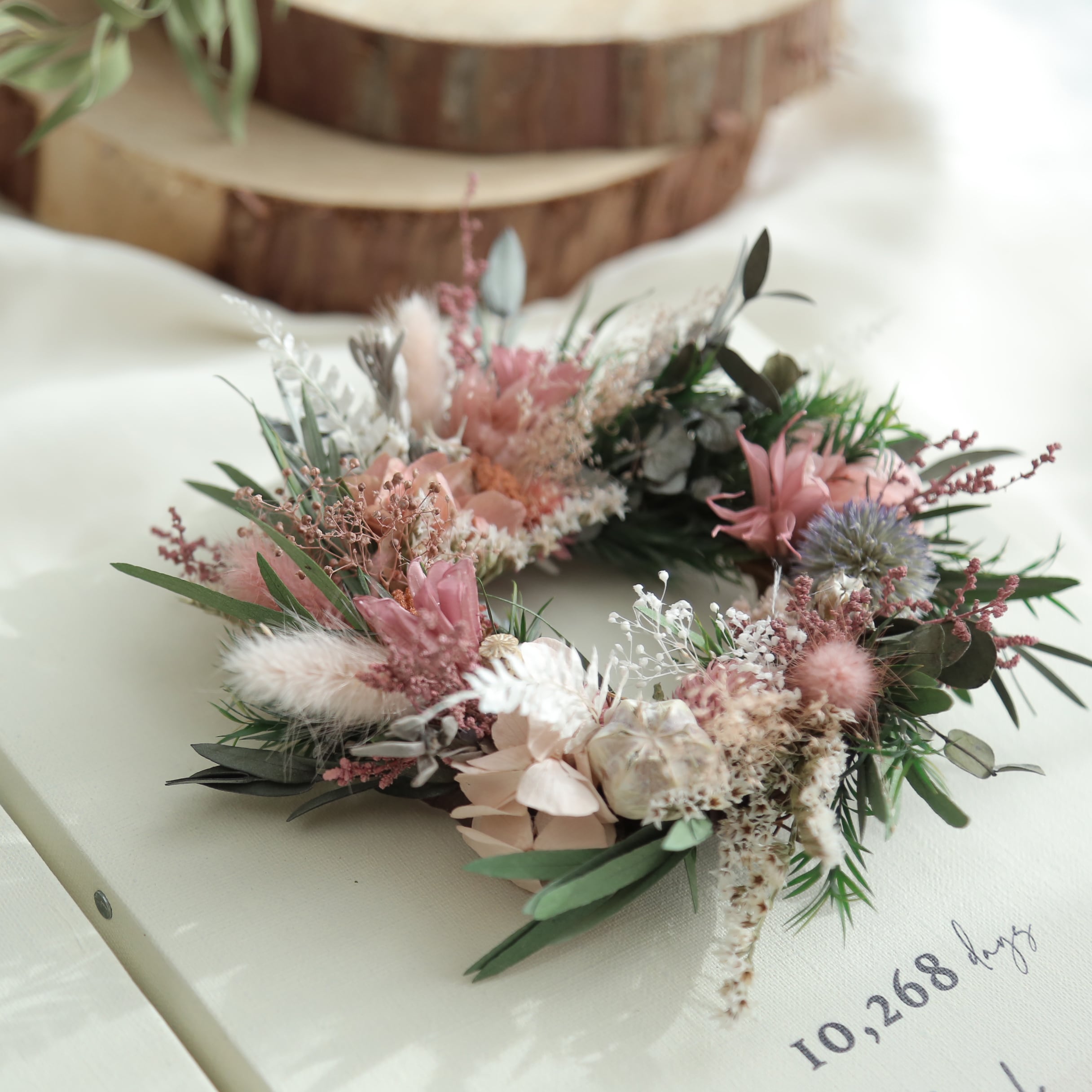 生花を乾燥させたお花です。時間の経過とともにアンティーク調に色合いが変化していきます。お花が落ちやすいのでなるべく触れないようにご注意ください。高温多湿を避けて保管をお願いします。