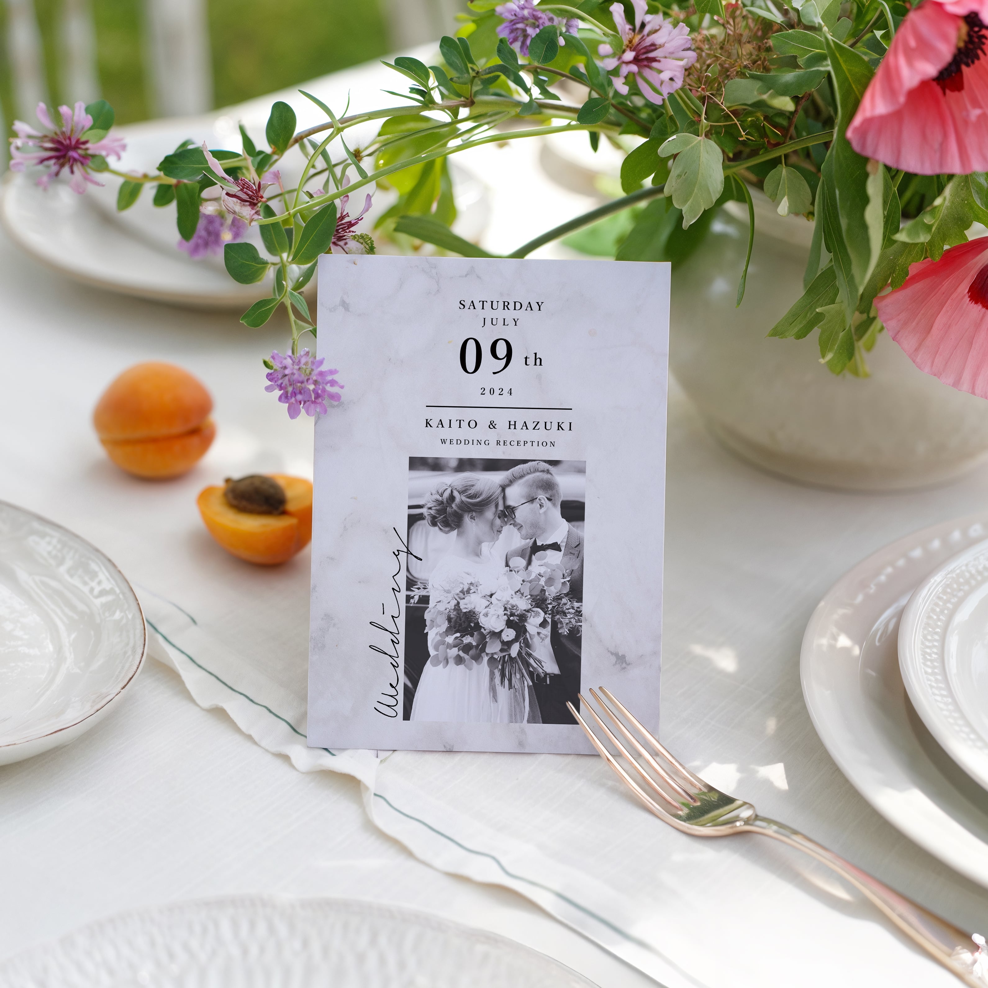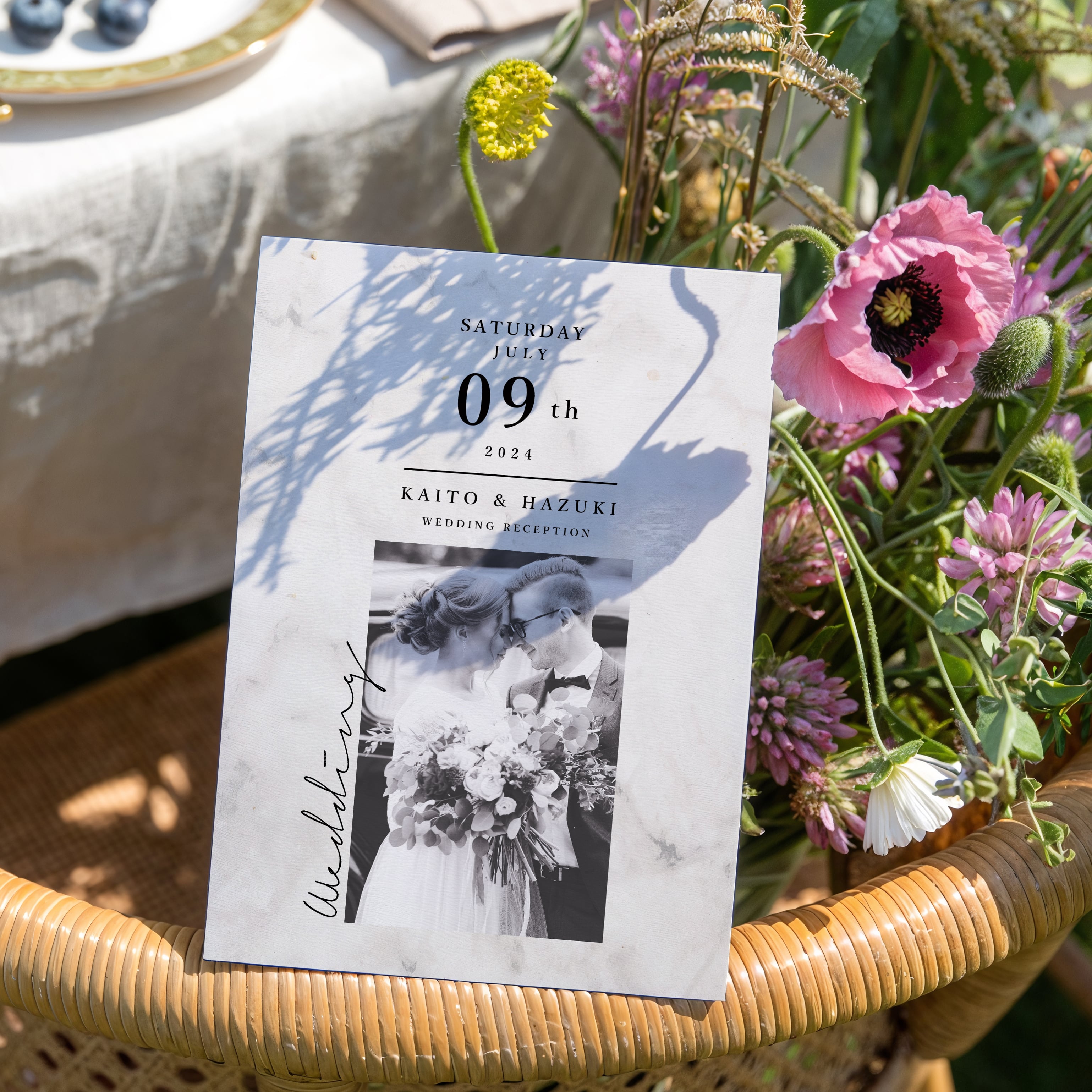 あえてくすみ感のある大理石柄を使用して作ったヴィンテージ調のシンプル席次表。