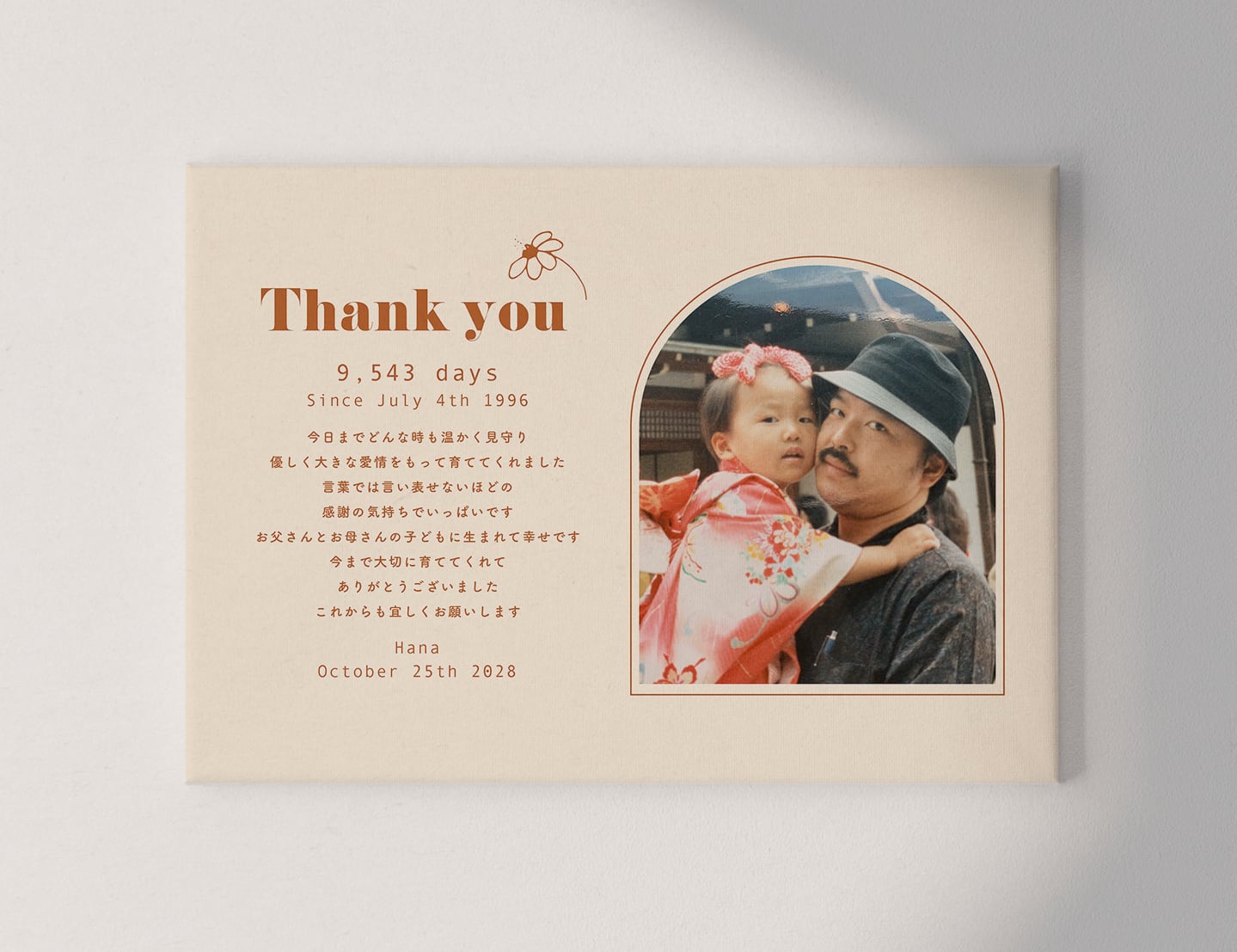 生まれた日から挙式日までの日数、お名前、挙式日、感謝のメッセージを印字します。