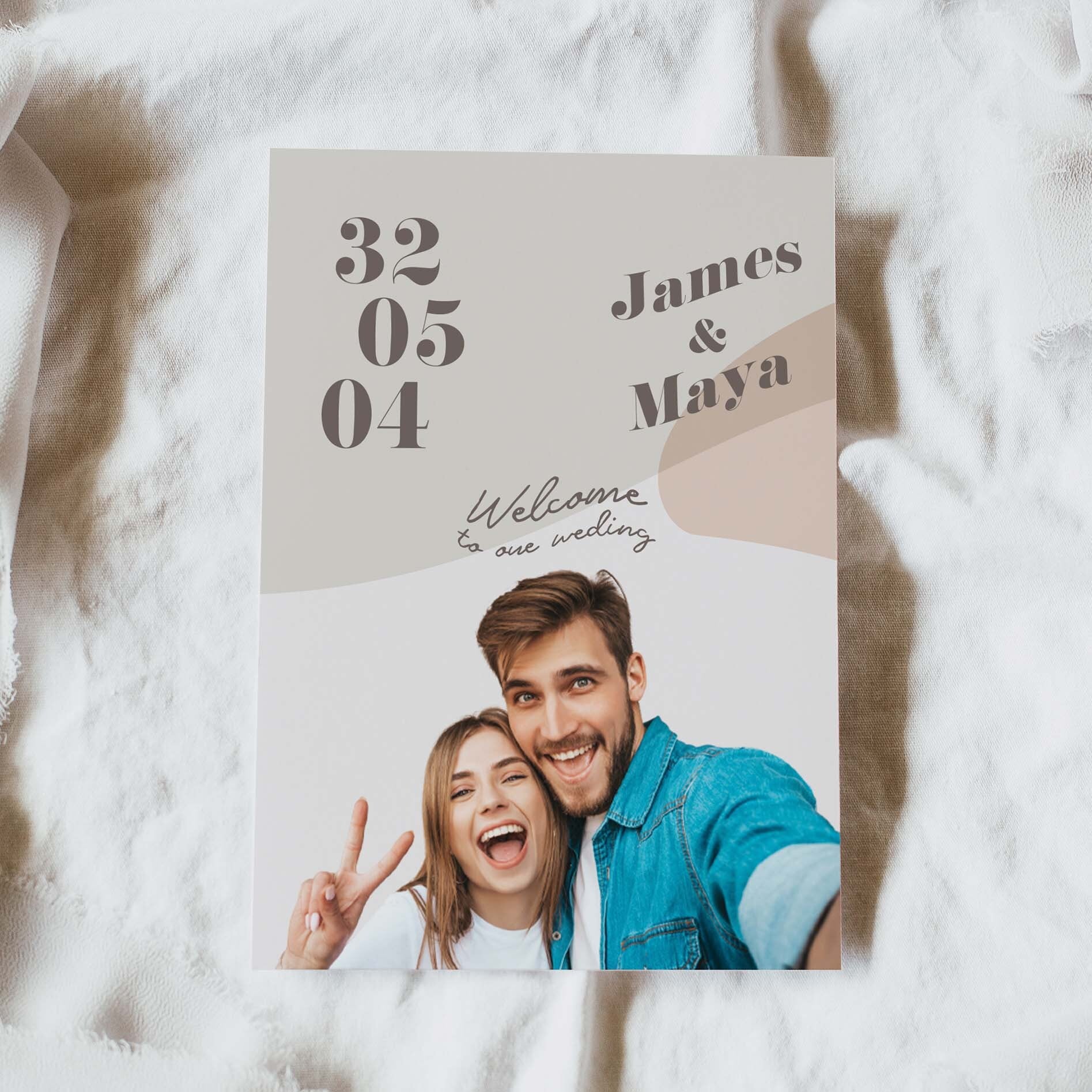 お二人のお好きな写真を加工して、ニュアンスカラーの招待状を作成します。