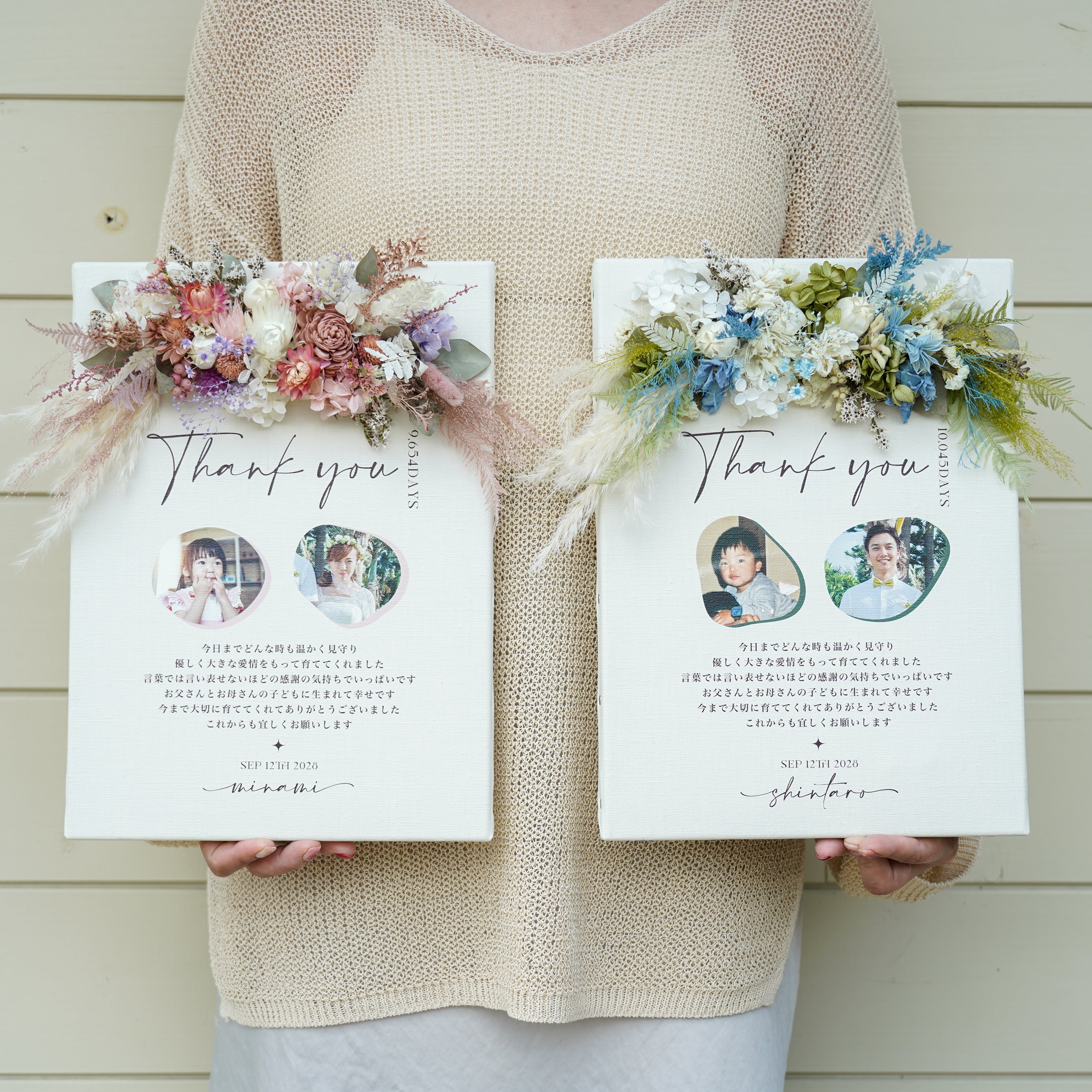 お二人の小さい頃と現在のお写真を入れて作成する子育て感謝状 2点セットです。