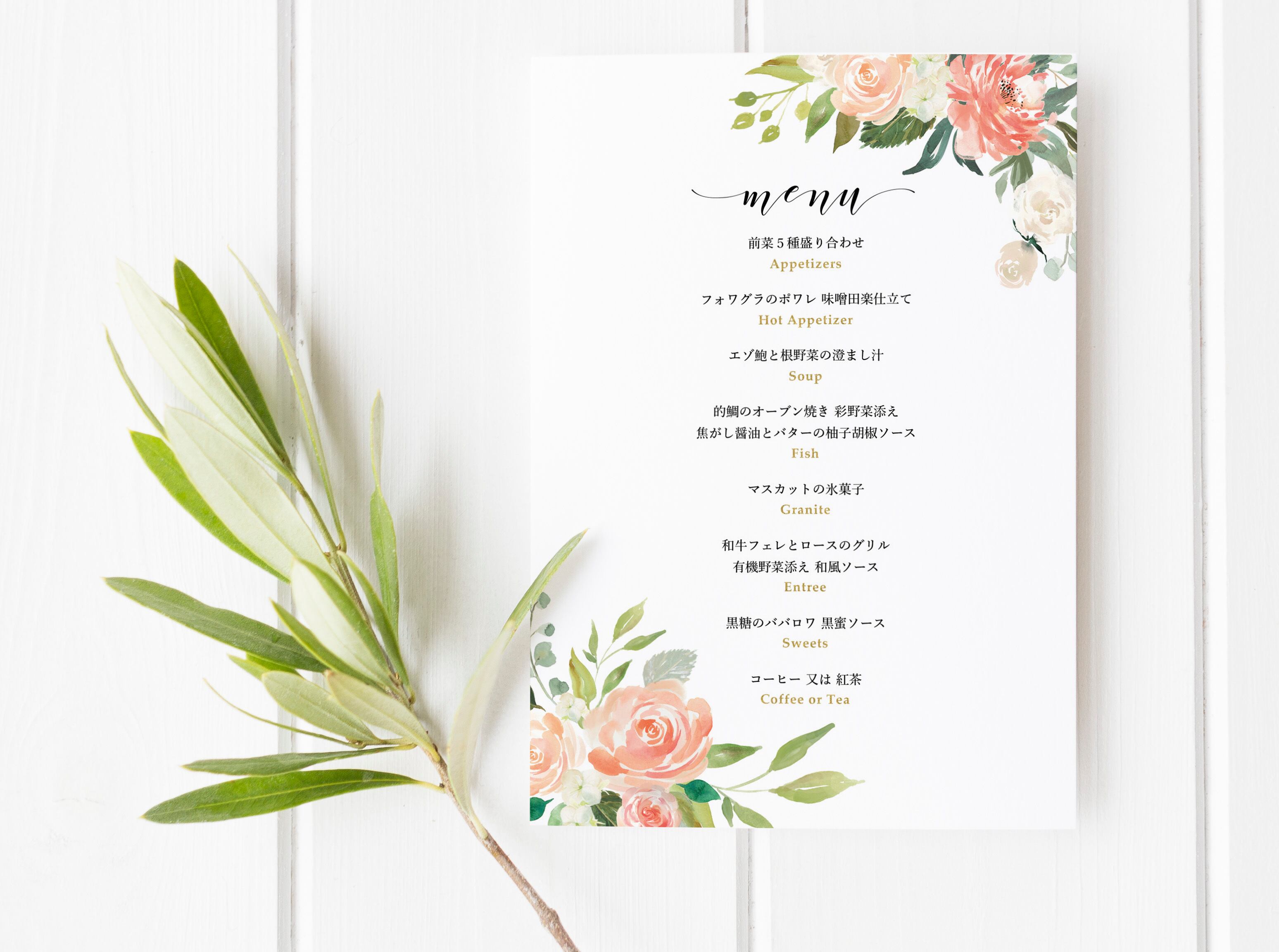 流行りのコーラルカラーでデザインしたピオニーとローズがかわいいメニュー表です。